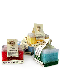A soap-sponge with fragrances of essential oils of Rosemary, Juniper, Lemon, Orange.